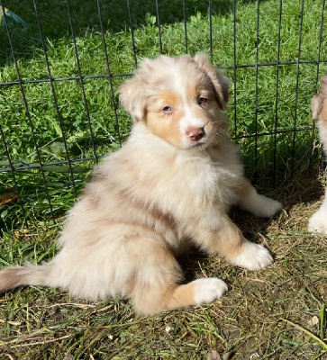 Jamie est la plus petite femelle, belle et costaude avec un rouge merle dark et des yeux particolores, elle est très jolie et sa tête est bien carrée. Je voyais un nouvel espoir pour l?élevage en elle, elle est parfaite! mais mes circonstances privées ne me permettent pas de la garder.